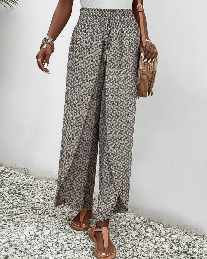These women's wide leg pants offer a comfortable and stylish option for everyday wear. Featuring a high waisted design and loose fit, they provide a flattering silhouette. The printed pattern adds a touch of personality, while the smocked and drawstring waist ensures a perfect fit. Ideal for creating relaxed and fashionable outfits.