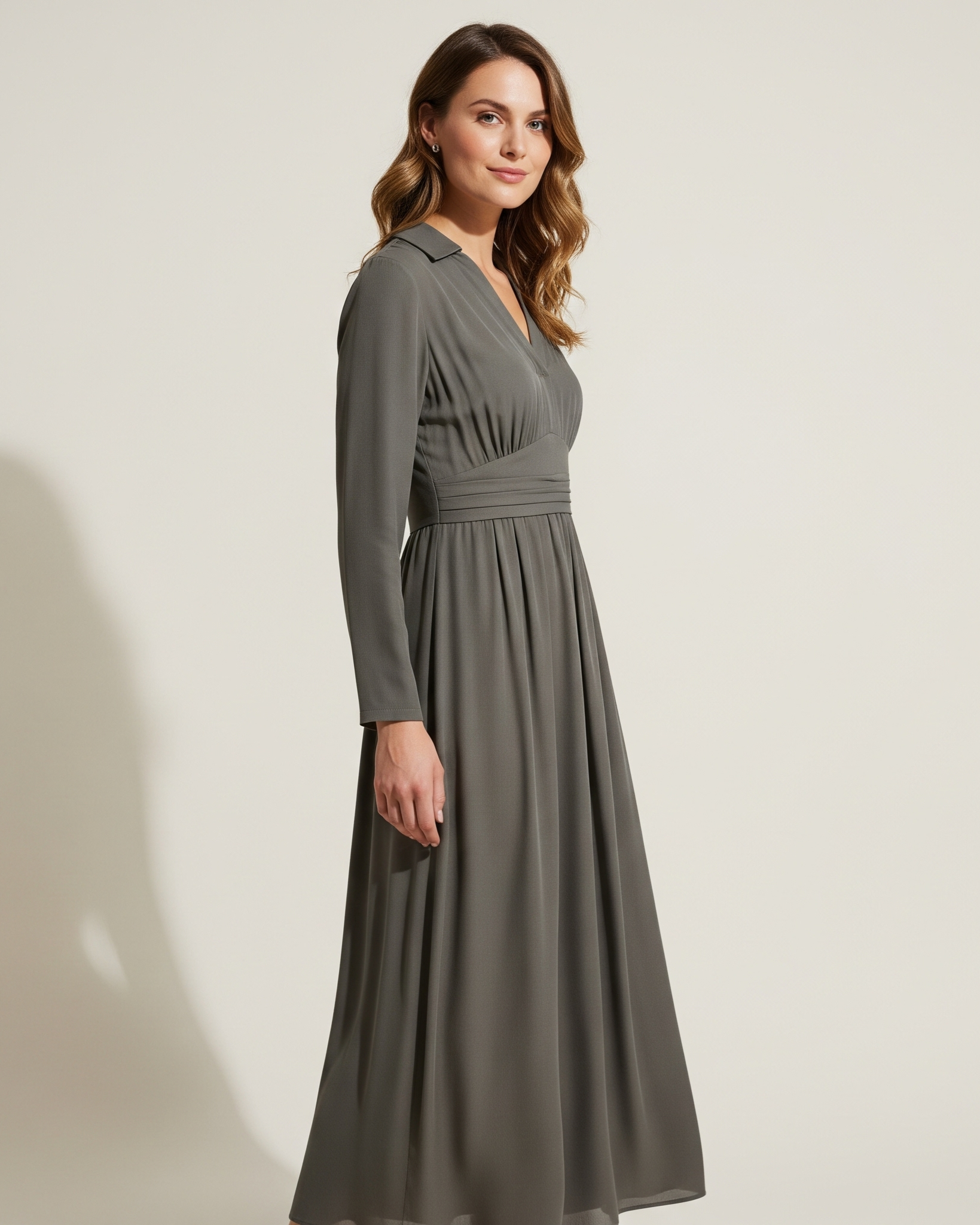 Elevate your style with this elegant V-neck midi dress. Crafted from a luxurious, flowing fabric, this dress falls gracefully to a sophisticated midi length, offering a perfect blend of modern style and timeless elegance. The flattering V-neckline and defined waist create a beautiful silhouette that is both comfortable and chic. Whether for a formal event or a special occasion, its versatile design and impeccable drape make it a stunning addition to any wardrobe.